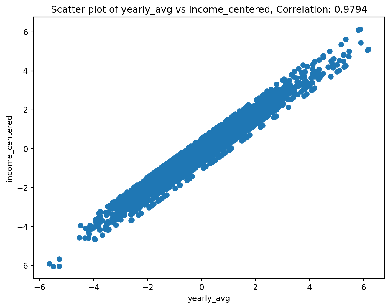 It appears there is not a correlation between farming income and the PDSI. This is due to different states having different average income levels. Thus we need to center the income for each state, as then we can focus on exploring the relationship between the change in income and change in PDSI. We will use center_column to do so.