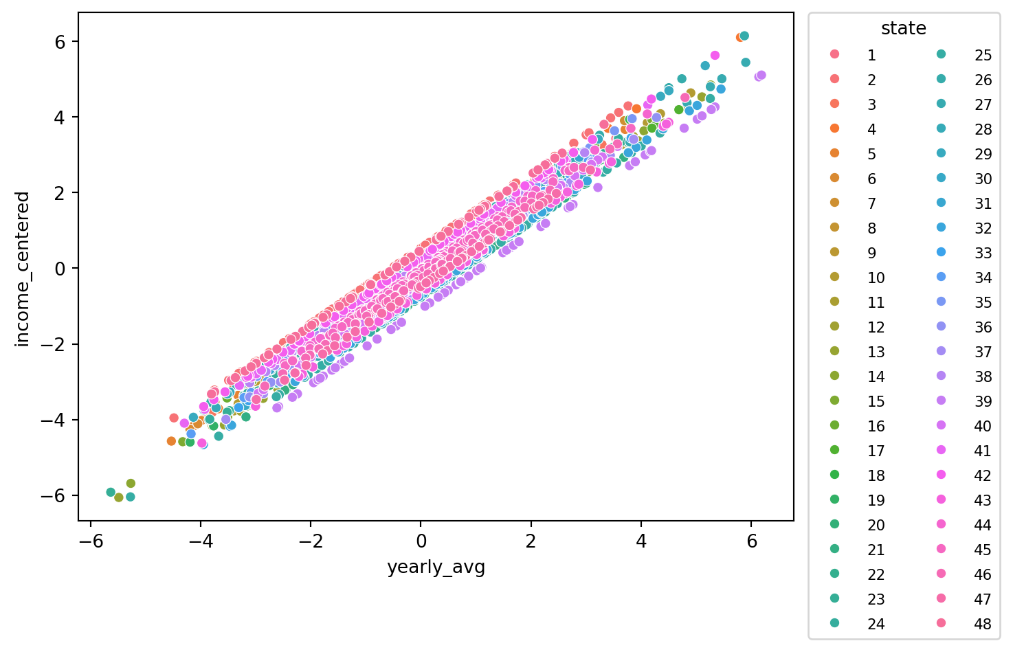 Through this plot we can see that each state appears to have a line of its points with a similar slope to each other state. The difference is the line's interecept. This causes us to note that some states perform above their average income with an average PDSI while other perform below their average income with an average PDSI. It is a relationship that would be worth exploring in the future.